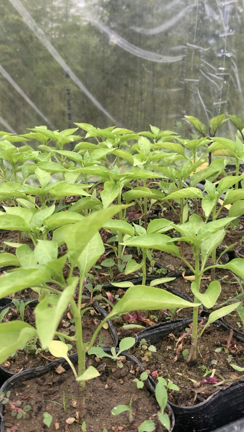 万願寺とうがらしの苗。多くの夏野菜は自家採種した種を繋いでいます。伏見甘長や鷹の爪、ピーマンにパプリカも育てていますがこの段階ではほとんど見分けがつかないほどみんな似ています。