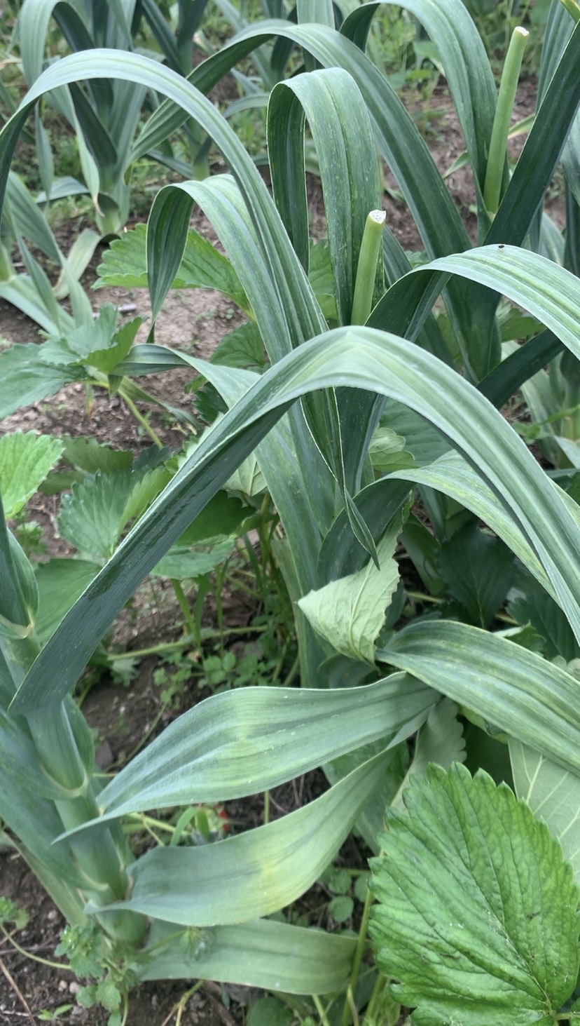 ジャンボニンニクとイチゴの混植。お互いの成長を促します。