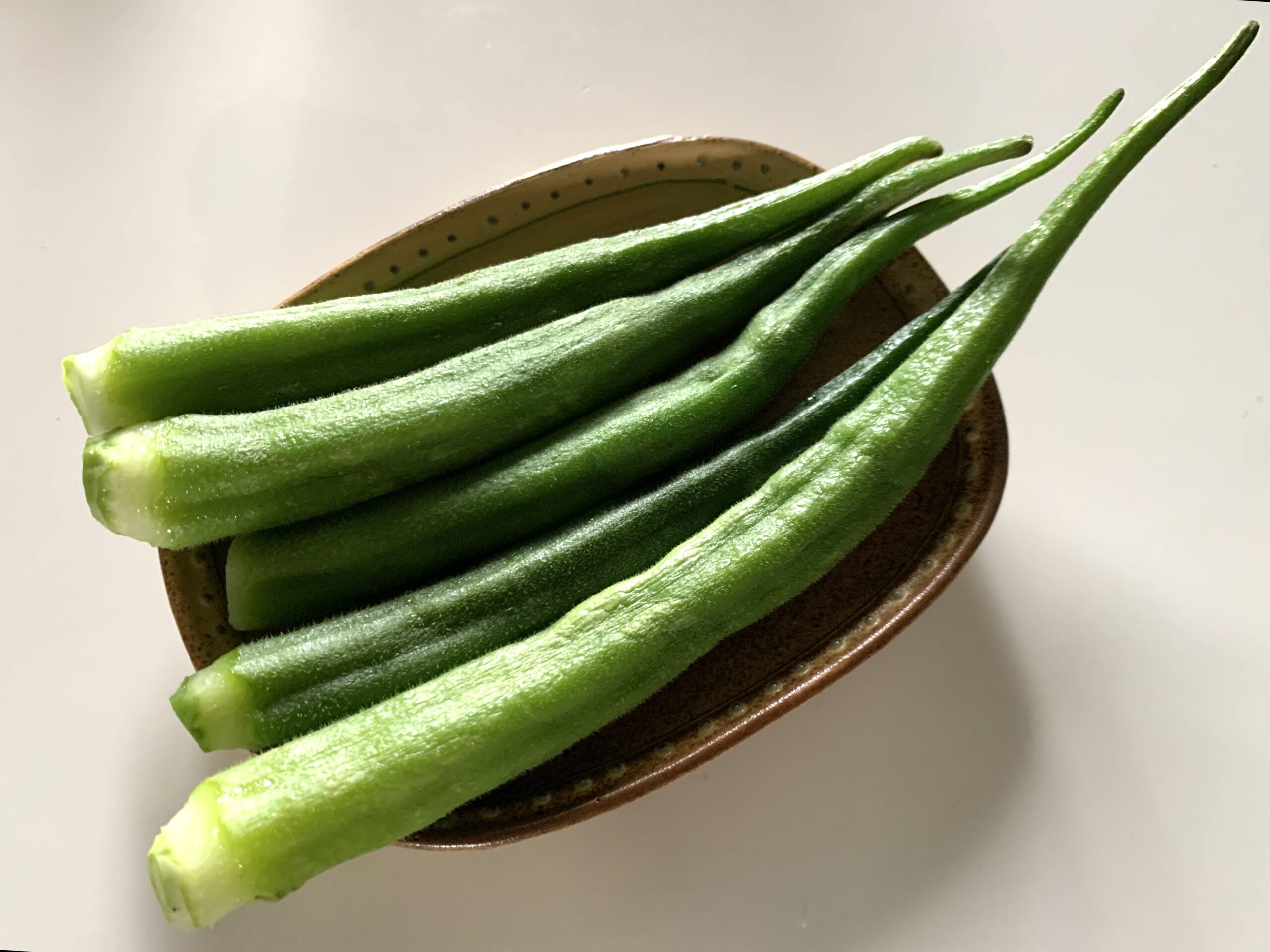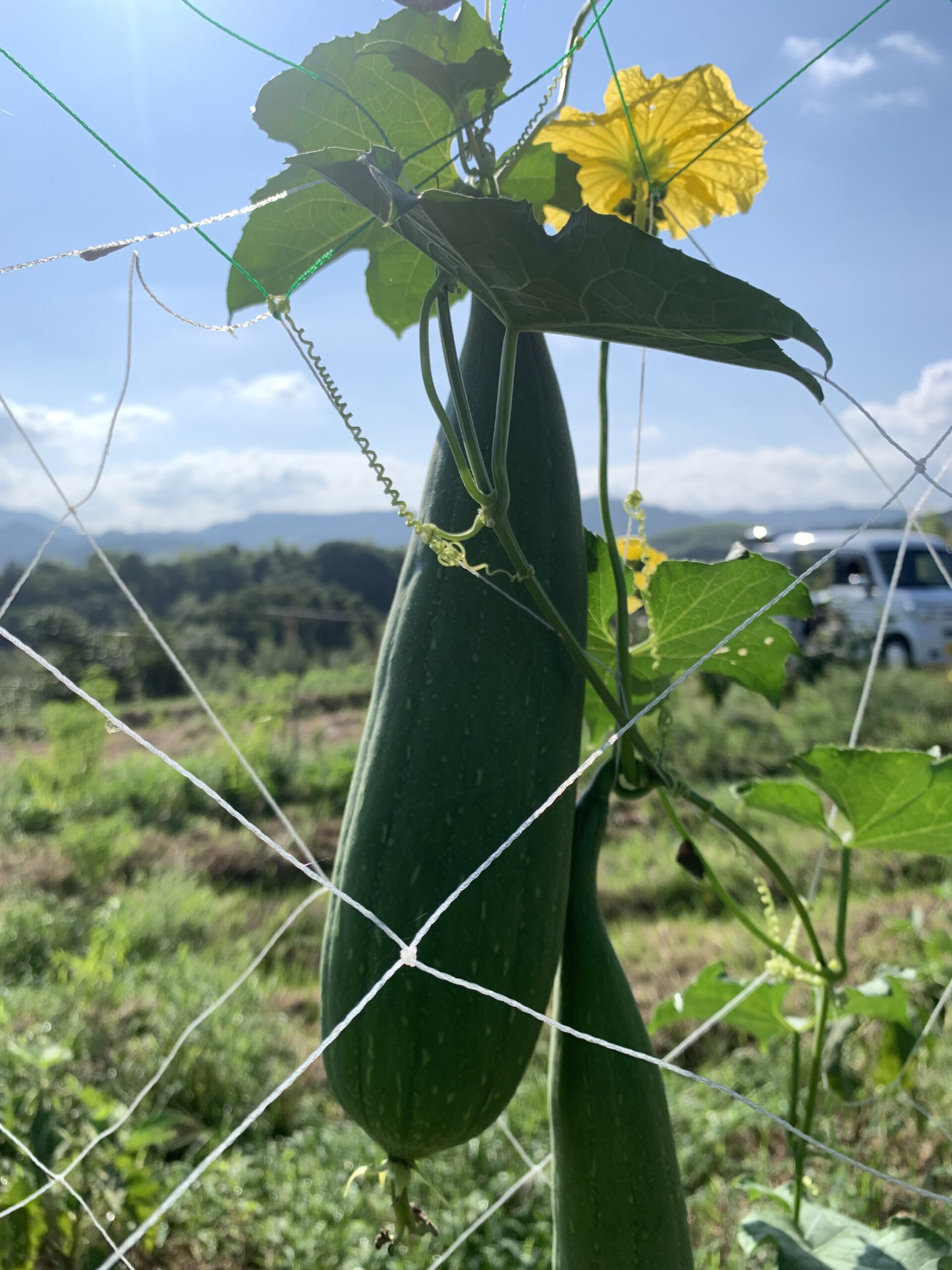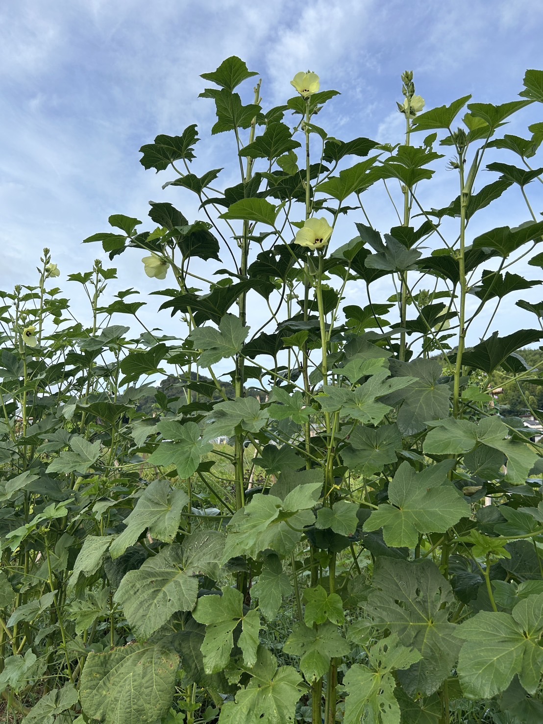 天高く舞うオクラ。この丸オクラは手のひら(20センチ)を超えても柔らかくて美味しい。